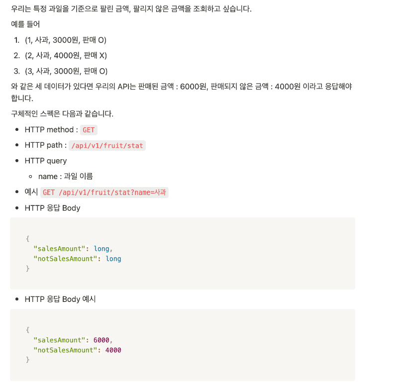 과일이 팔리게 되면, 우리 시스템에 팔린 과일 정보를 기록해야 한다. 스팩은 아래와 같다.