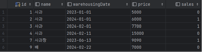 현재 fruits 테이블은 아래와 같이 구성 되어있다고 하자. sales가 0이면 판매X, 1이면 판매O 이다.