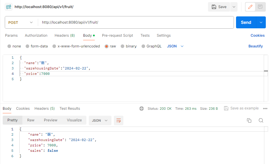 우리는 작은 과일 가게를 운영하고 있습니다. 과일 가게에 입고된 "과일 정보" 를 저장하는 API를 만들어 봅시다. 스펙은 아래와 같다.