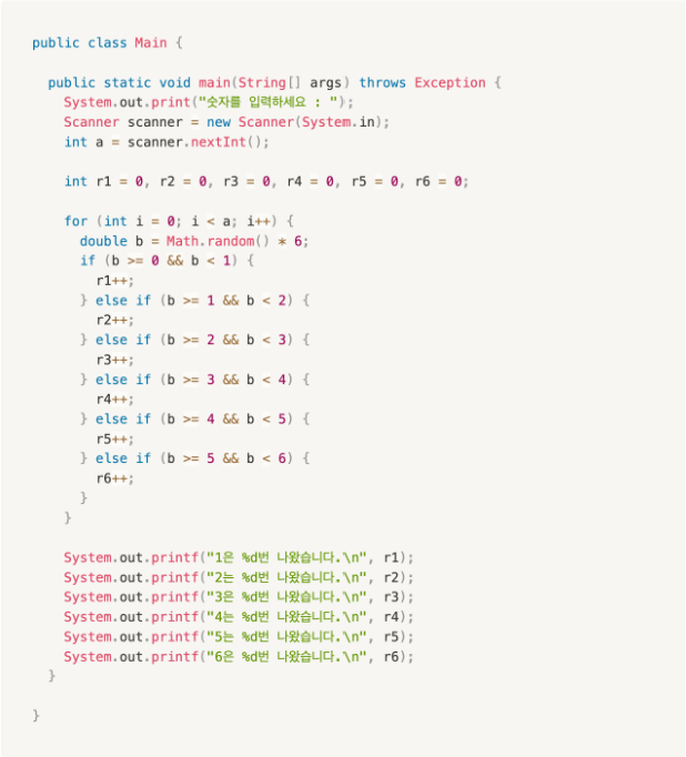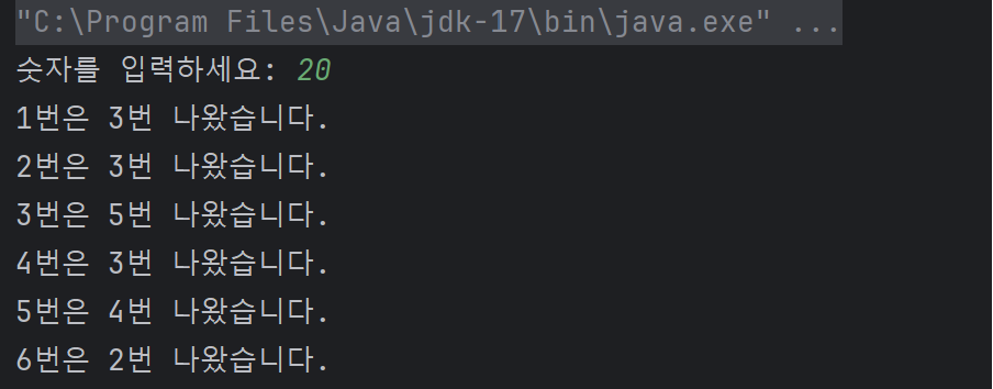 System.out.println((i+1)+"번은 "+elementDice[i]+"번 나왔습니다.");