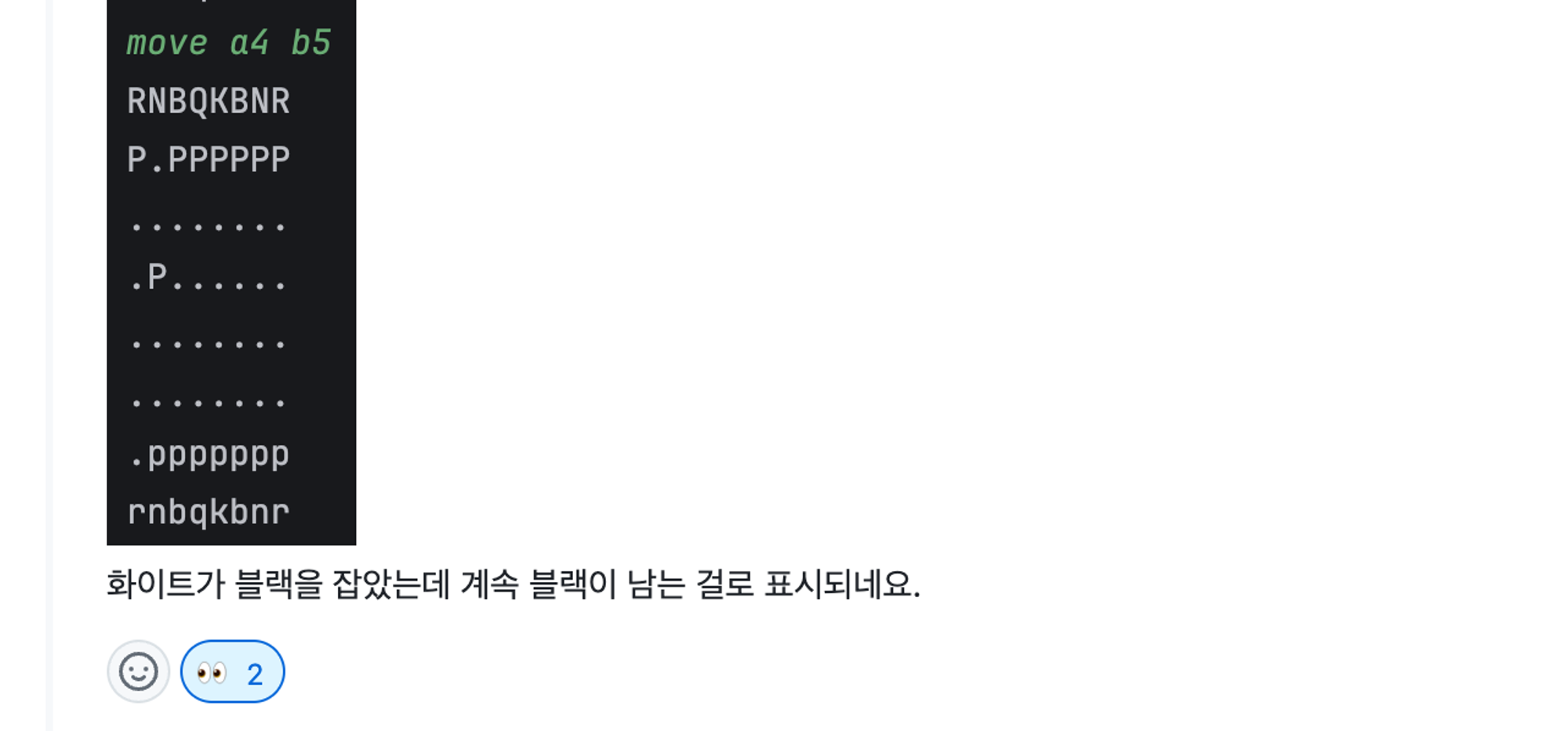 체스 미션 도중 발생한 문제였다. 분명 문제 없이 돌아가는 걸 확인하고 미션을 제출했는데 리뷰어로부터 다음과 같은 리뷰를 받았다.