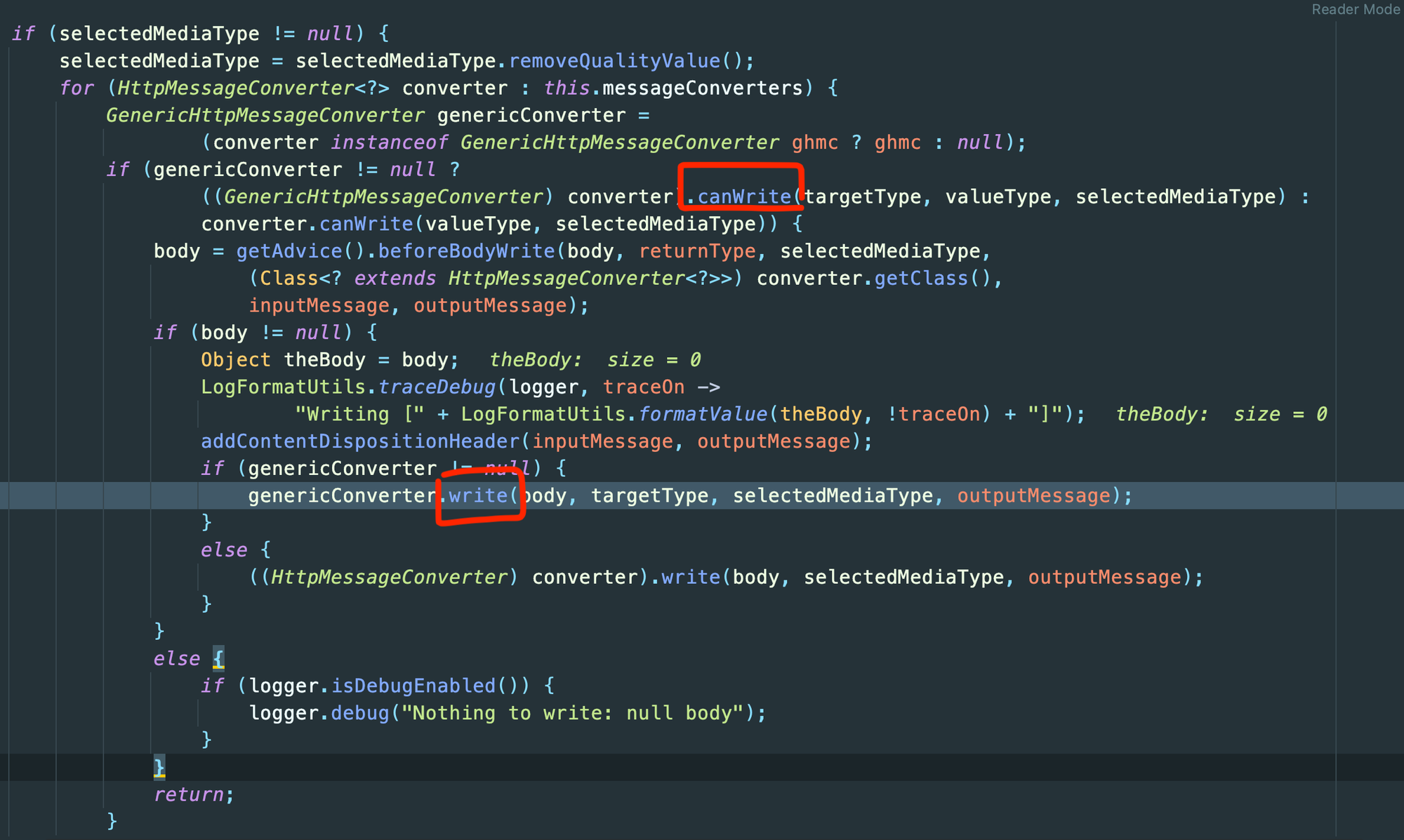 writeWithMessageConverters() 메서드를 살펴보면 위에서 살펴본 컨버터의 canWrite() / write()가 쓰이고 있음을 알 수 있다.