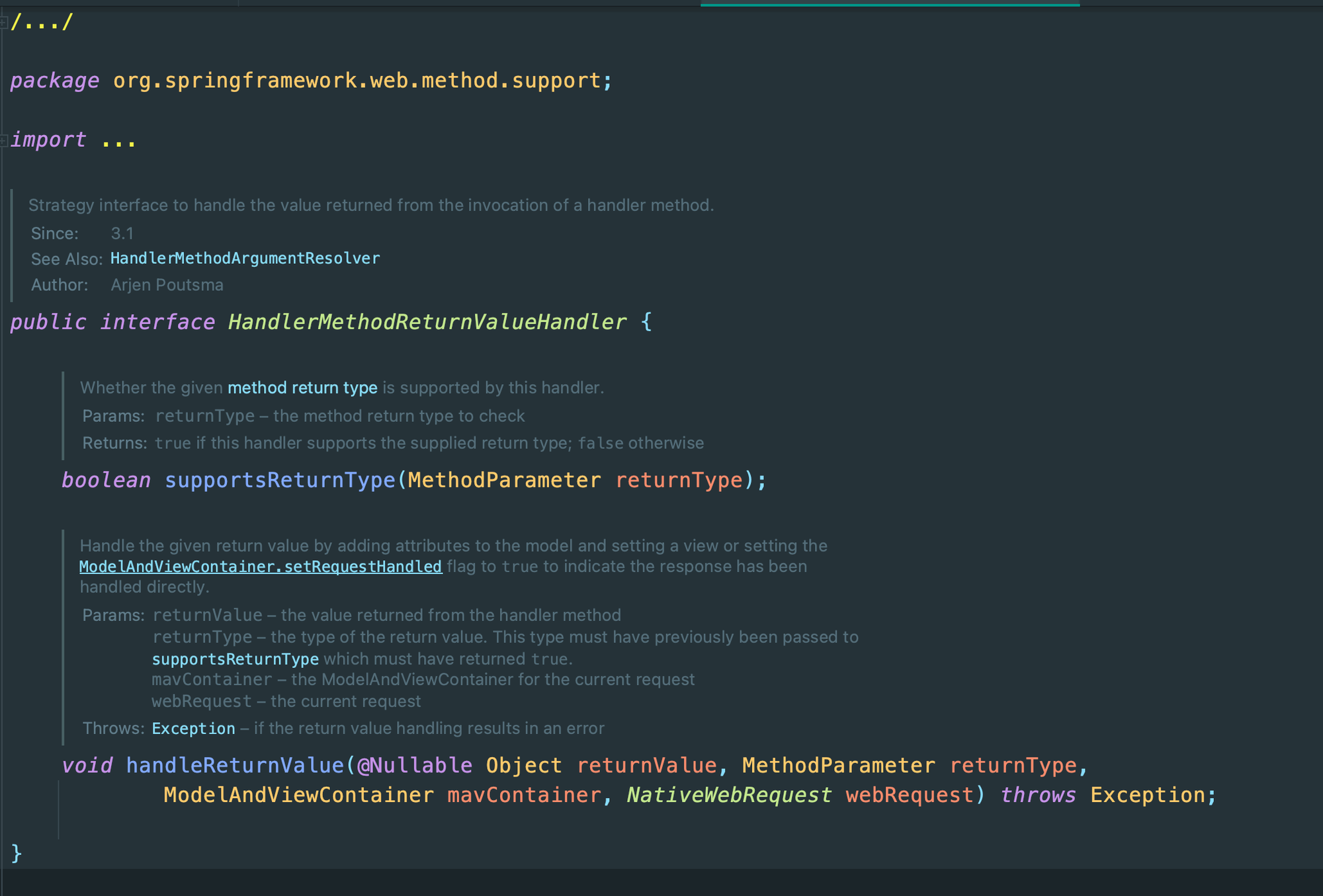 HandlerMethodReturnValueHandler(ReturnValueHandler) 인터페이스의 handleReturnValue()에 의해 컨트롤러의 반환 값을 변환한다.