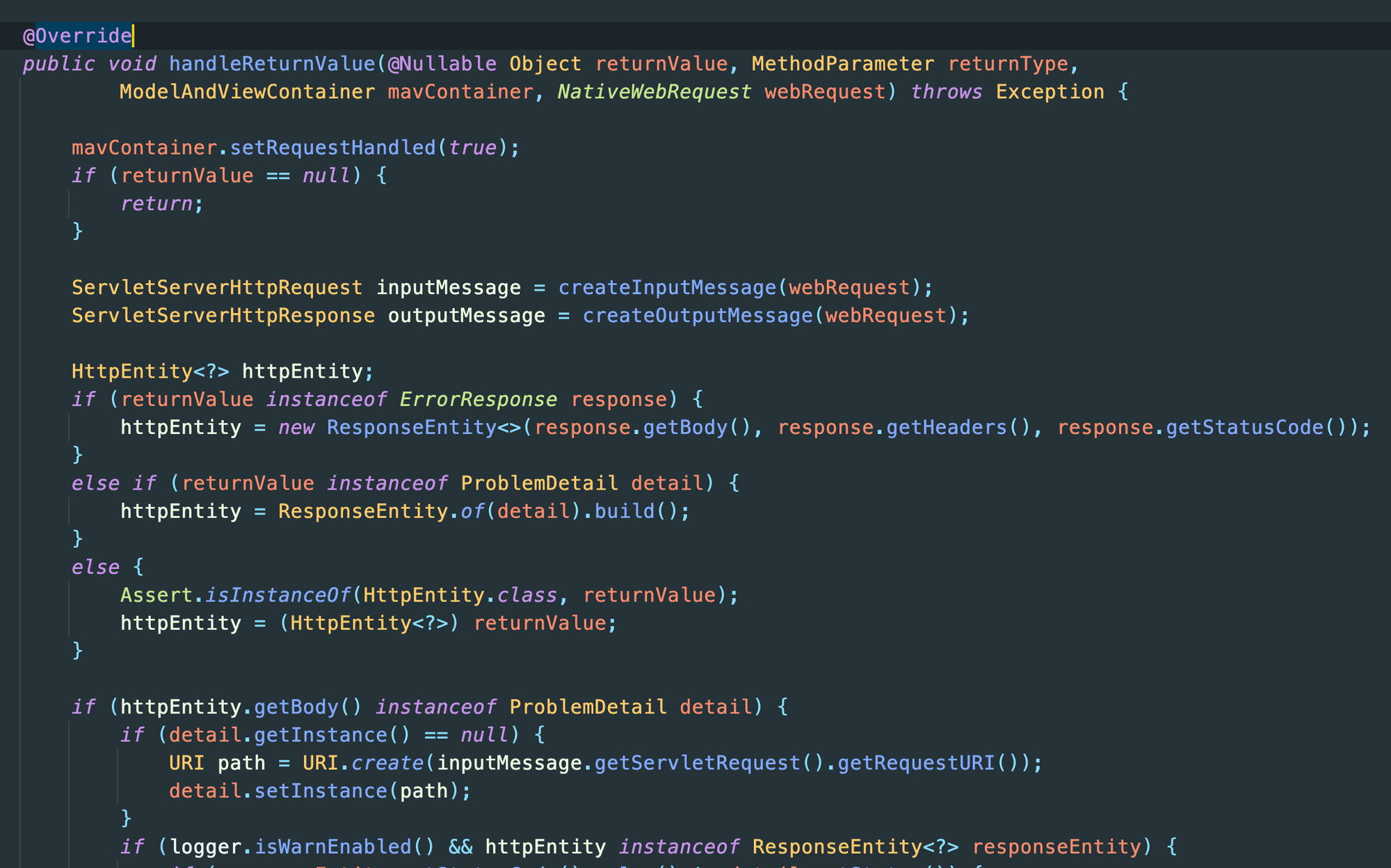 HandlerMethodReturnValueHandler 의 구현체인 HttpEntityMethodProcessor 를 사용한다. handleReturnValue()가 재정의되어 있다.