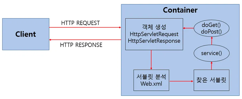 이러한 서블릿들을 관리해주는 것이 서블릿 컨테이너이다. 서블릿 컨테이너는 서블릿들의 생성, 실행, 파괴, 즉 생명주기를 담당한다. 서블릿 컨테이너는 구현되어 있는 서블릿 클래스의 규칙에 맞게 서블릿을 관리해주며 클라이언트의 요청에 따라 HttpServletRequest, HttpServletResponse 두 객체를 생성하여 HttpMethod 여부에 따라 동적인 페이지를 생성하여 응답을 내보낸다. 서블릿 컨테이너의 대표적인 예시로는 톰캣이 있으며 톰캣은 웹 서버와 통신하여 JSP(자바 서버 페이지)와 Servlet이 작동하는 환경을 제공해준다.