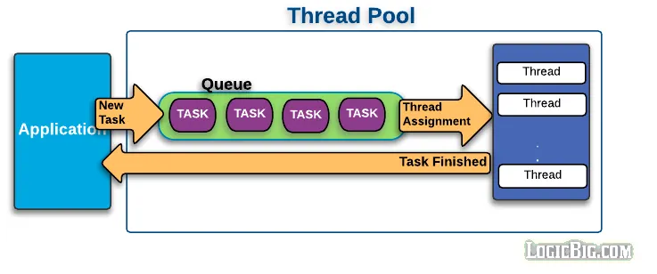스레드풀을 자바에서 구현한 구현체가 ThreadPoolExecutor이다. 다음과 같이 스레드 풀의 사이즈를 2로 지정하고 3개의 스레드를 submit하면 2개는 실행되고 나머지 1개는 큐에서 대기한다.