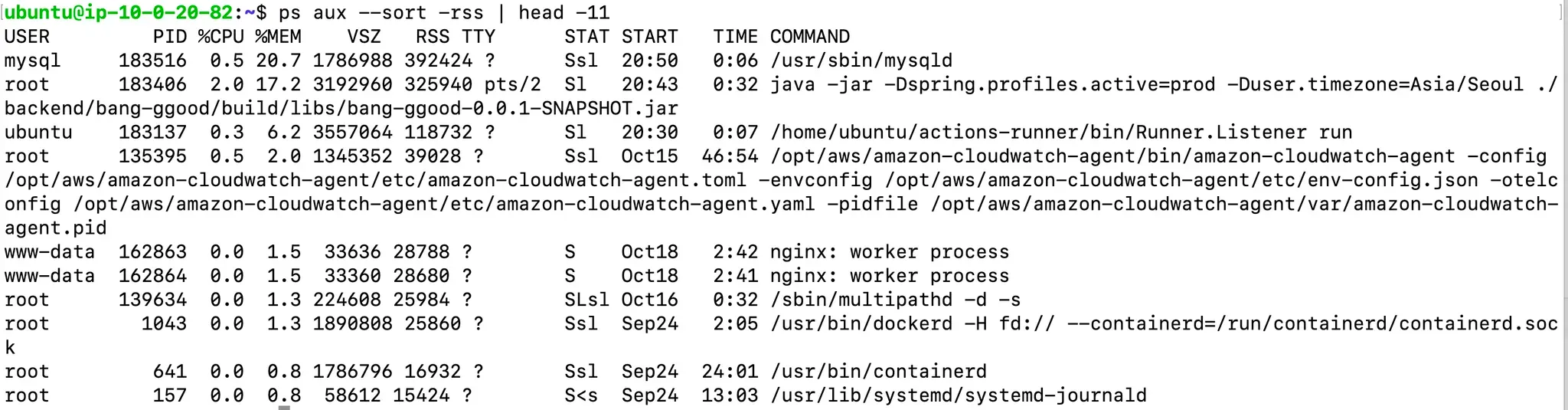 서버에서 포트를 활용해 2대의 애플리케이션을 추가적으로 띄우는 방식도 고민했다. 해당 방식이 가능한지 확인하기 위해 서버에서 사용중인 리소스를 확인해보았다.
