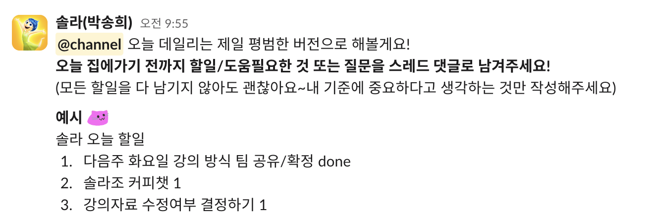 솔라의 주최로 오늘 집에 가기 전까지 할 일/도움이 필요한 것 또는 질문을 서로 공유하는 시간을 가졌다. 원래 데일리 미팅 시간에는 이런 것들을 공유하는 시간인데 우리가 너무 게임만해서 솔라가 준비한 듯했다.