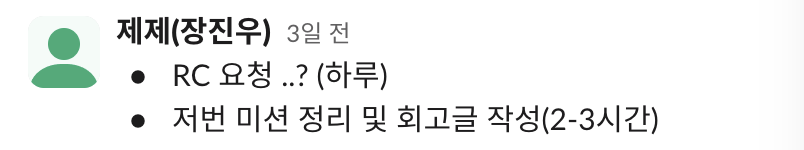 금요일날 적은 내 할 일은 결국 제시간에 끝내지 못했다. 이번 미션에서의 또다른 목표는 리뷰어와 피드백을 빠르게 주고받는 것이다. 저번 미션에서 리뷰 하나당 너무 오랫동안 고민하느라 피드백 요청이 느려졌고 마감시간에 대한 압박이 점점 심해졌었다. 이번에는 적당히 고민해보고 빠르게 구현한 후 시간이 남을 때 필요한 공부를 하려했다. 최대한 빠르게 한다해도 RC요청까지 이틀은 걸린 것 같다.