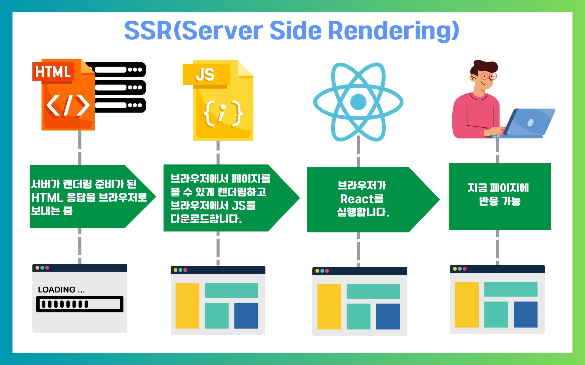 FCP 단축: 서버에서 미리 HTML을 만들어 제공하므로, 브라우저가 콘텐츠를 화면에 그리는 시간(First Contentful Paint)이 빨라져 사용자 경험이 향상된다.