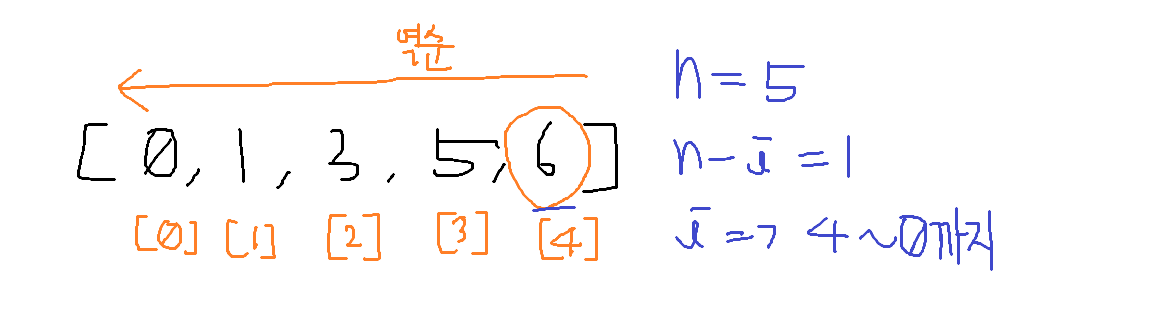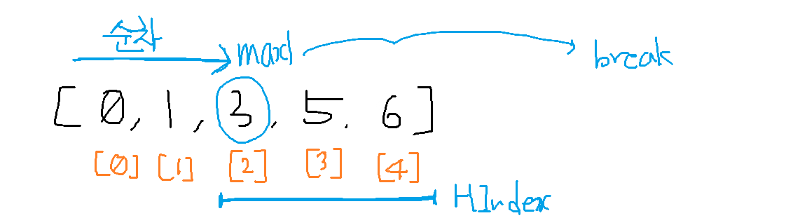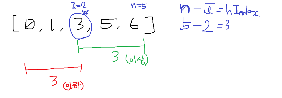 | 인덱스 (i) | 인용 횟수 (citations[i]) | n − i (자신 포함 우측 논문 수) | 조건: citations[i] ≥ (n − i) |