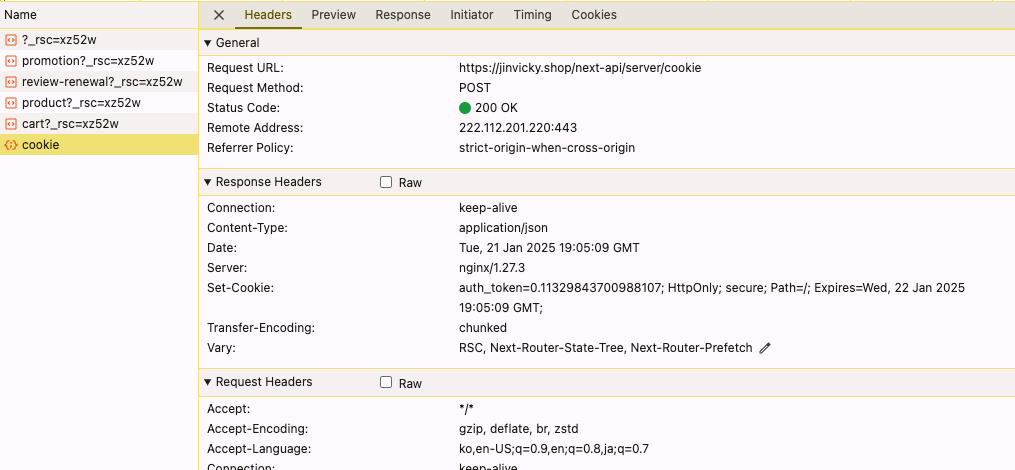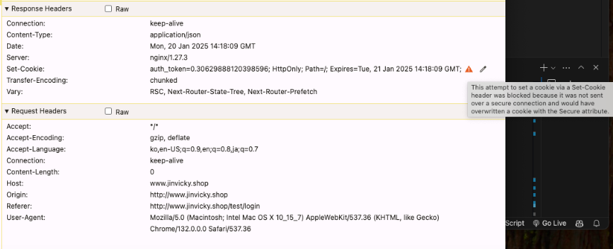 또한 Set-Cookie 헤더 옆에 있던 경고 아이콘이 말끔히 사라졌습니다.