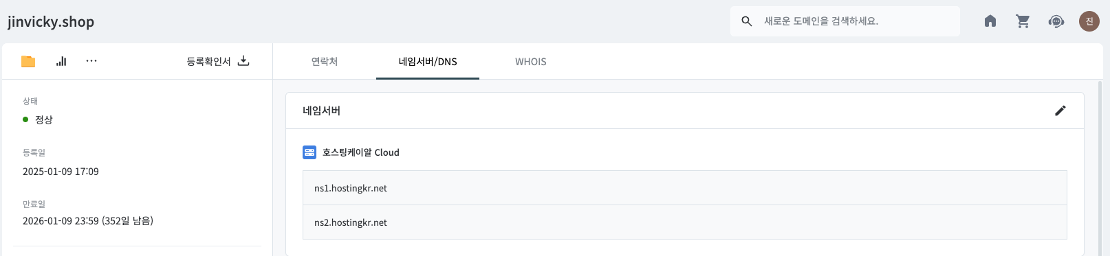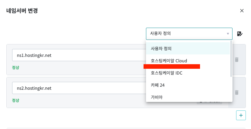 네임서버를 기본에서 호스팅케이알 Cloud로 변경해줍니다. (과금 없는 무료 변경입니다)