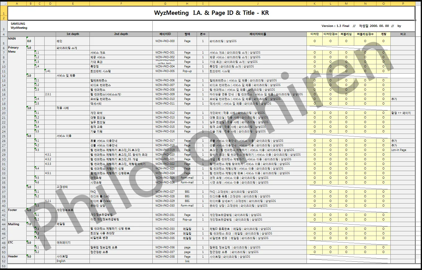 들어가야 할 내용은 도메인, 개발 언어, 호스팅, 개발 기한 정도가 들어간다. Depth, Tab/Sub Flow, Code, 페이지 정의, 요구사항, 세부 사항, Page, 개발 구분, 논의 사항으로 구성하고 완성한다.