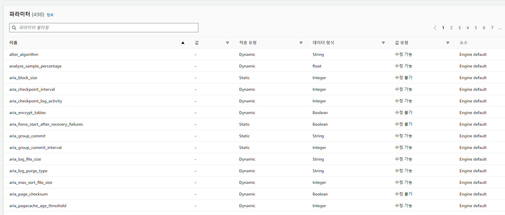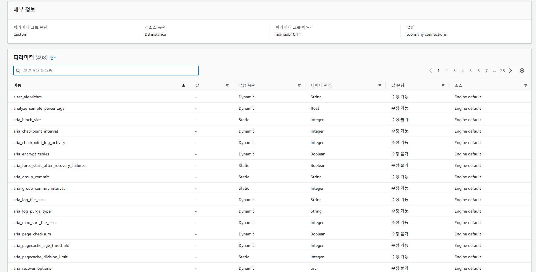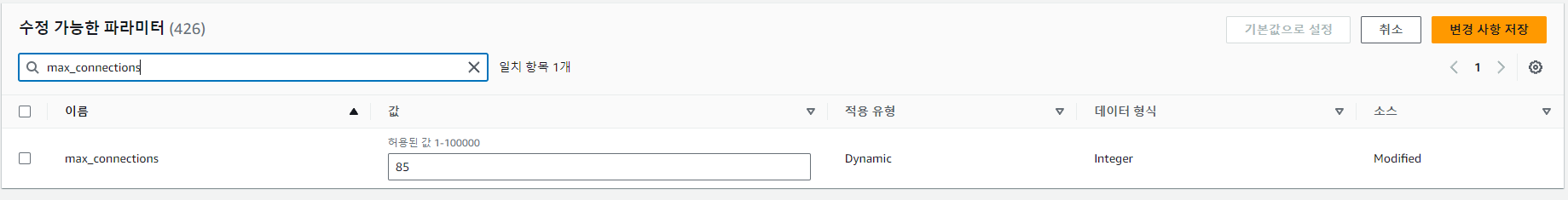 AWS RDS 파라미터 그룹에 들어가서 파라미터 설정을 변경해주었다.