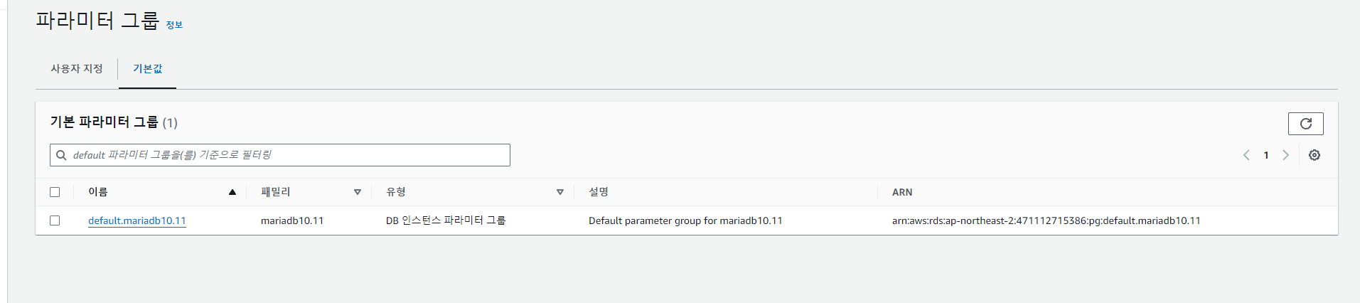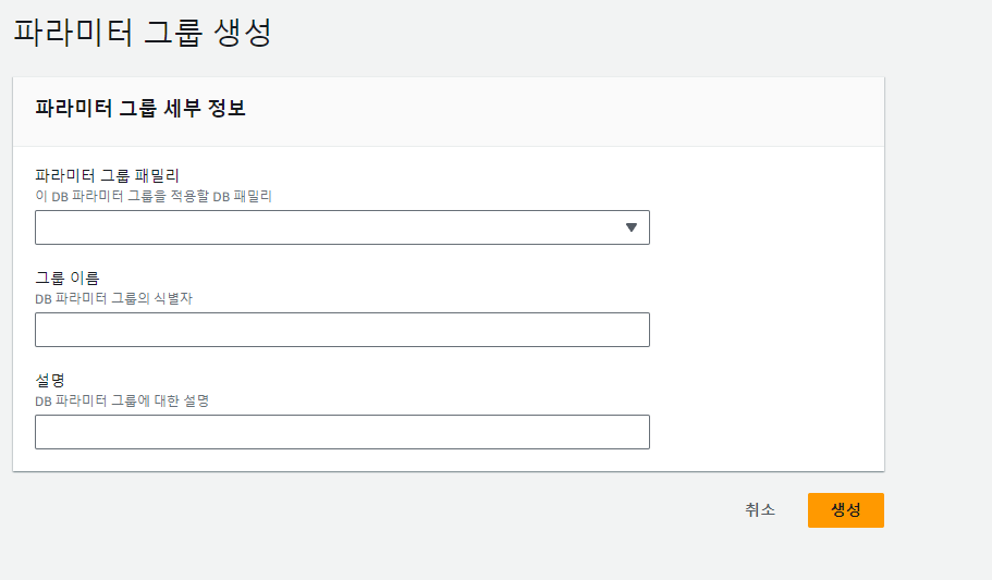 이렇게 나오면 파라미터 그룹 패밀리에 현재 쓰고있는 DB와 버전을 확인한 후 맞는 것을 찾아 지정해 준 후