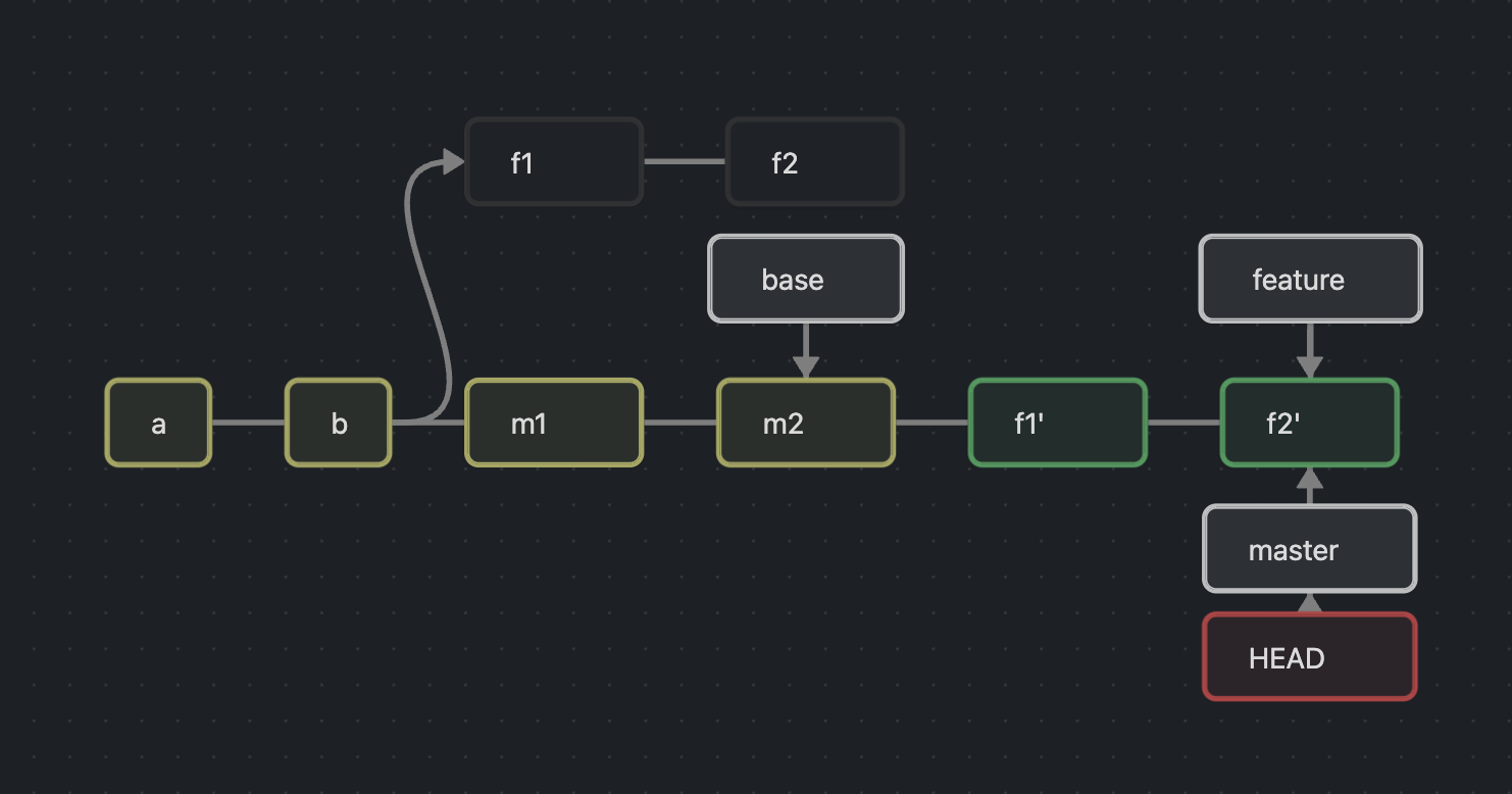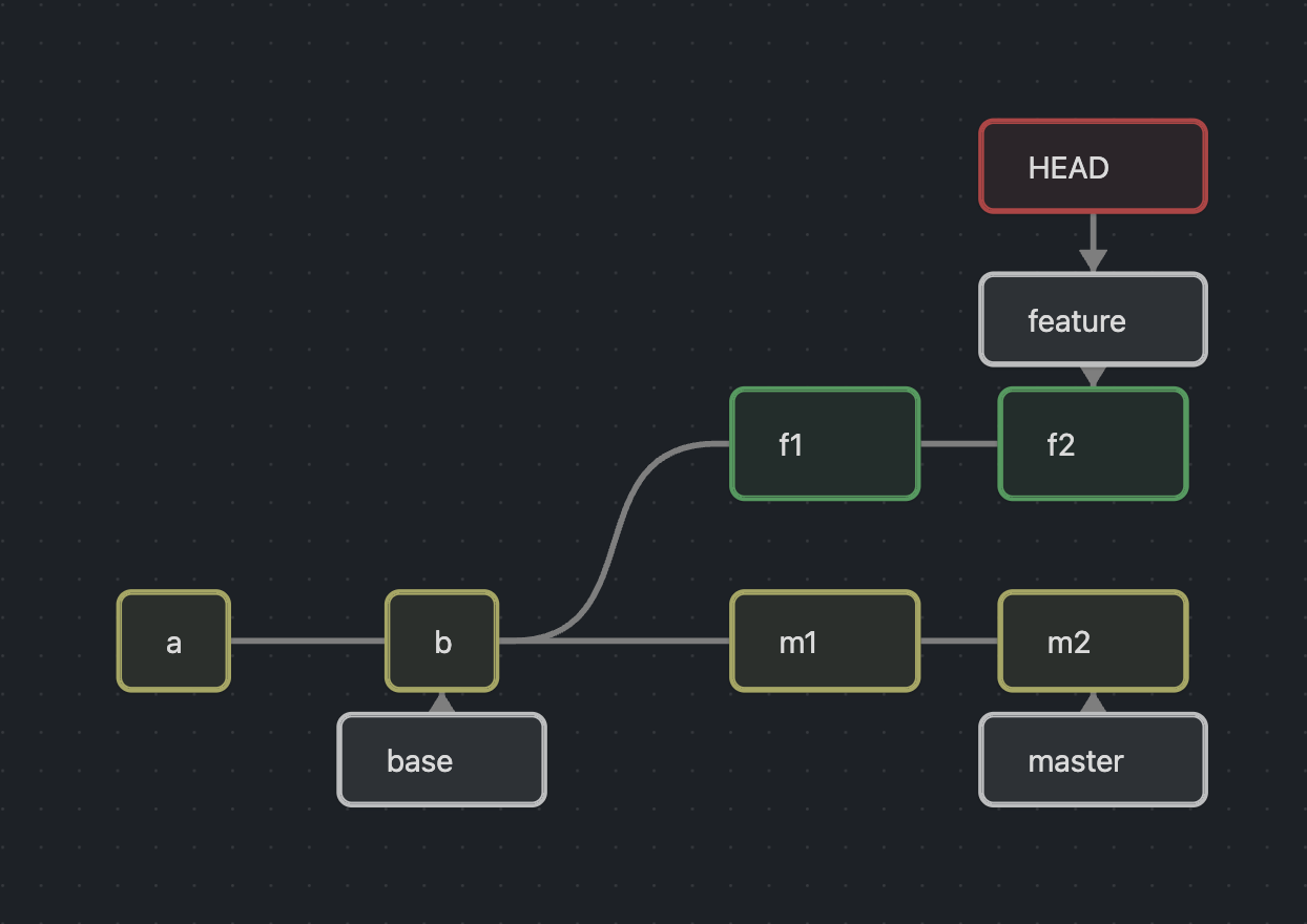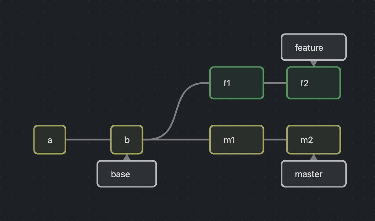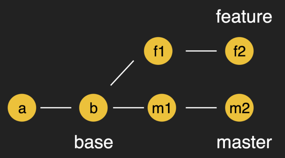 예를 들어, feature 브랜치와 master 브랜치가 있다고 가정해봅시다. 각 브랜치의 마지막 커밋은 f2와 m2이고, 공통 조상 커밋(base)을 b라고 합시다. 3-way merge 과정은 다음과 같습니다.