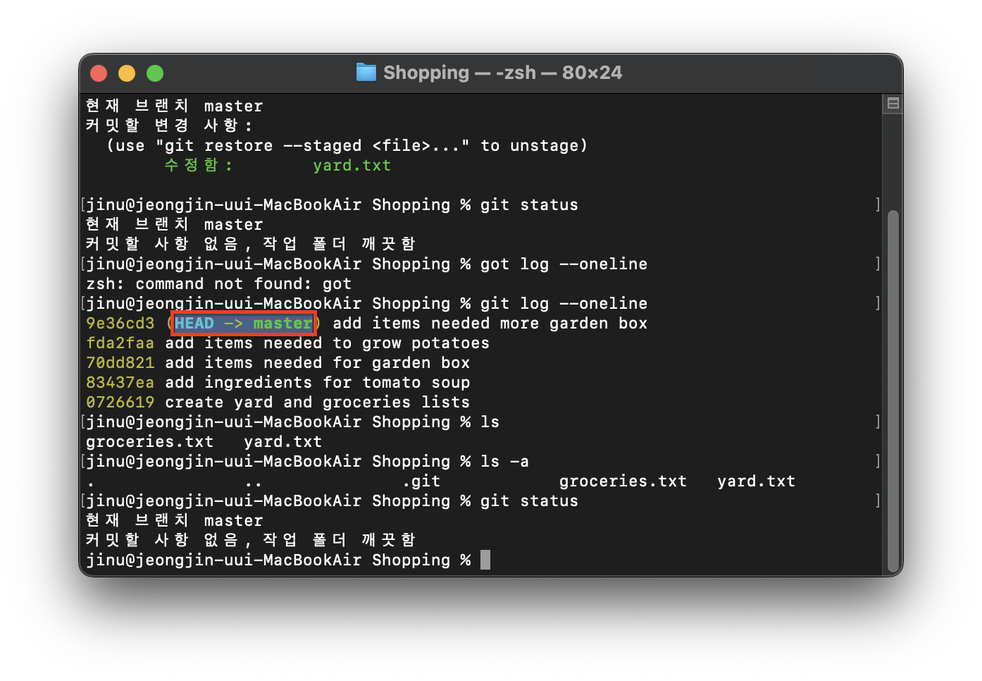 HEAD는 현재 작업중인 브랜치를 가리키는 화살표라고 생각하면 됩니다. master는 기본 개발 라인의 이름입니다. 따라서 HEAD -> master는 "현재 작업 중인 브랜치는 기본 개발 라인(master)입니다" 라는 뜻 입니다.