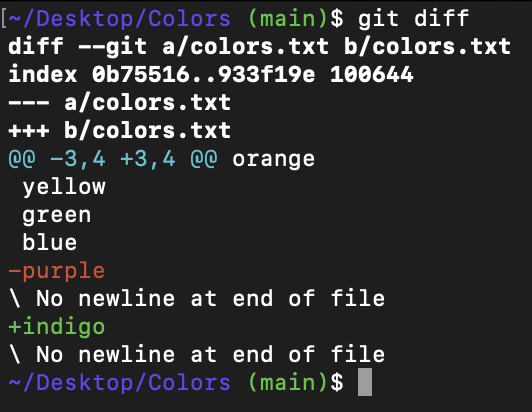 -로 시작하는 줄은 삭제된 줄을 나타내고, +로 시작하는 줄은 추가된 줄을 나타냅니다. 따라서 purple이 indigo로 변경되었다는 것을 알 수 있습니다.
