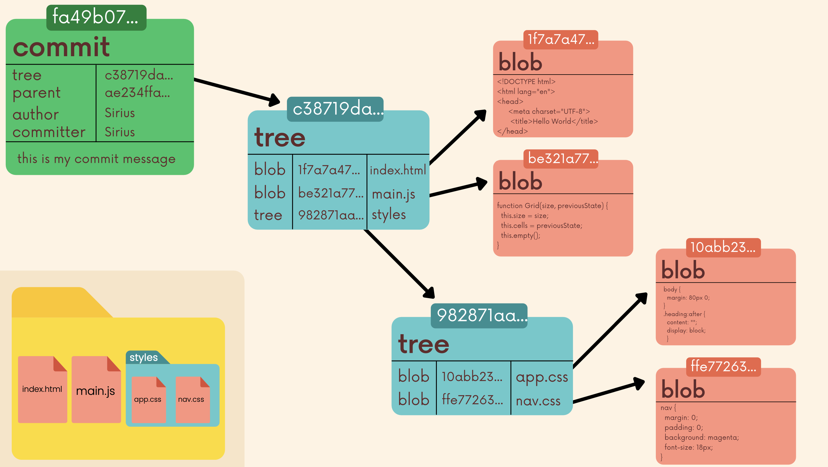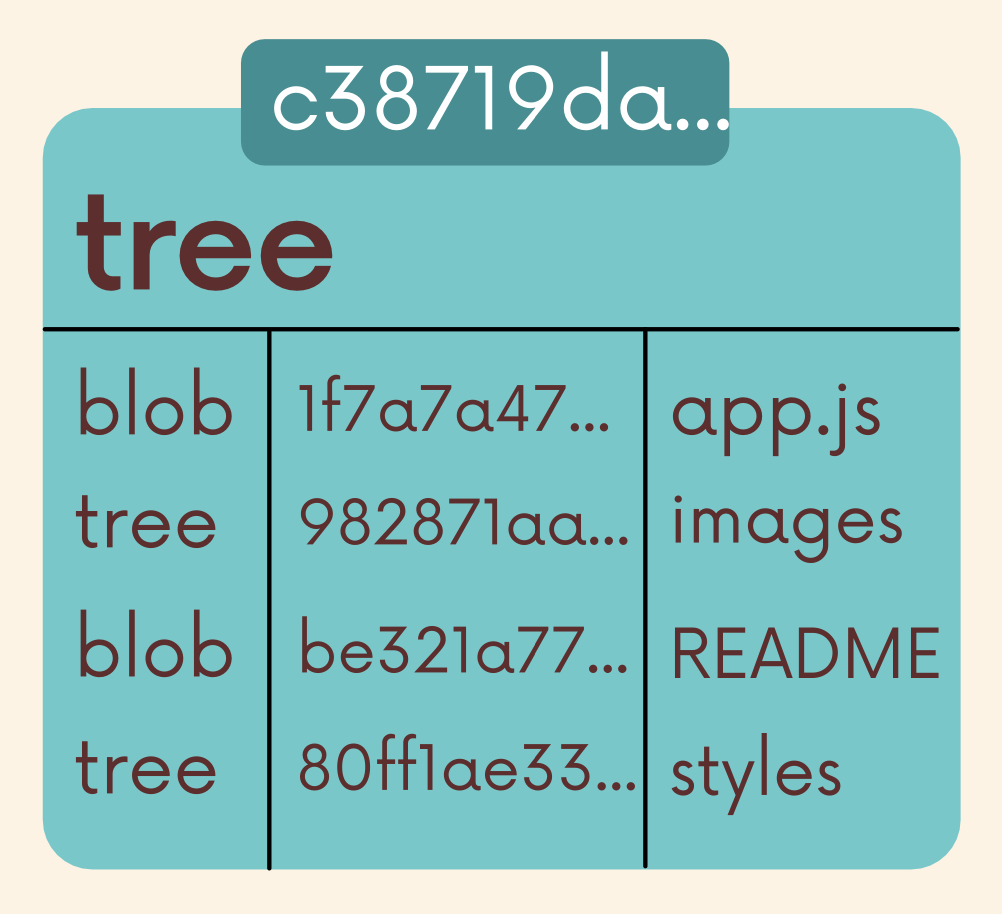 - Tree 오브젝트는 디렉토리(폴더)를 나타내며, 디렉토리 내의 파일들을 Blob 오브젝트로, 그리고 하위 디렉토리들을 다른 Tree 오브젝트로 참조합니다. 따라서, Tree 오브젝트는 디렉토리의 구조를 표현하게 됩니다.