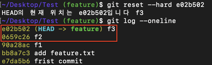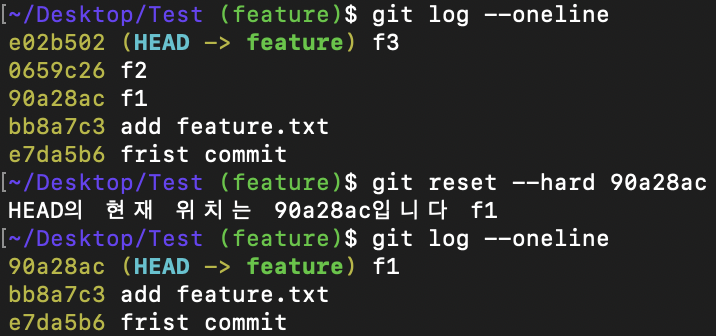 git reset --hard 명령어를 사용하여 HEAD~2까지 되돌렸습니다. git log --oneline 명령어를 사용하여 확인하면 HEAD~2 이후의 커밋들이 git log를 통해 보이지 않습니다. 그러나 실제로 삭제되는 것은 작업 트리와 인덱스의 변경 내용뿐이고, 이전 커밋들은 Git 데이터베이스에 여전히 존재합니다.
