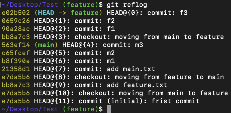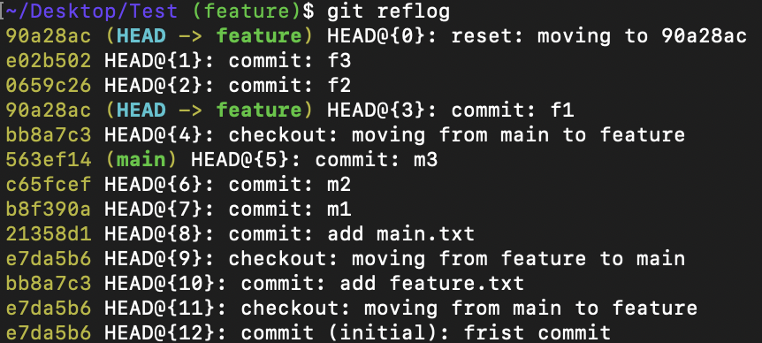 이때 git reflog 명령어를 사용하면 삭제된 커밋의 정보를 확인하거나 복구할 수 있습니다.