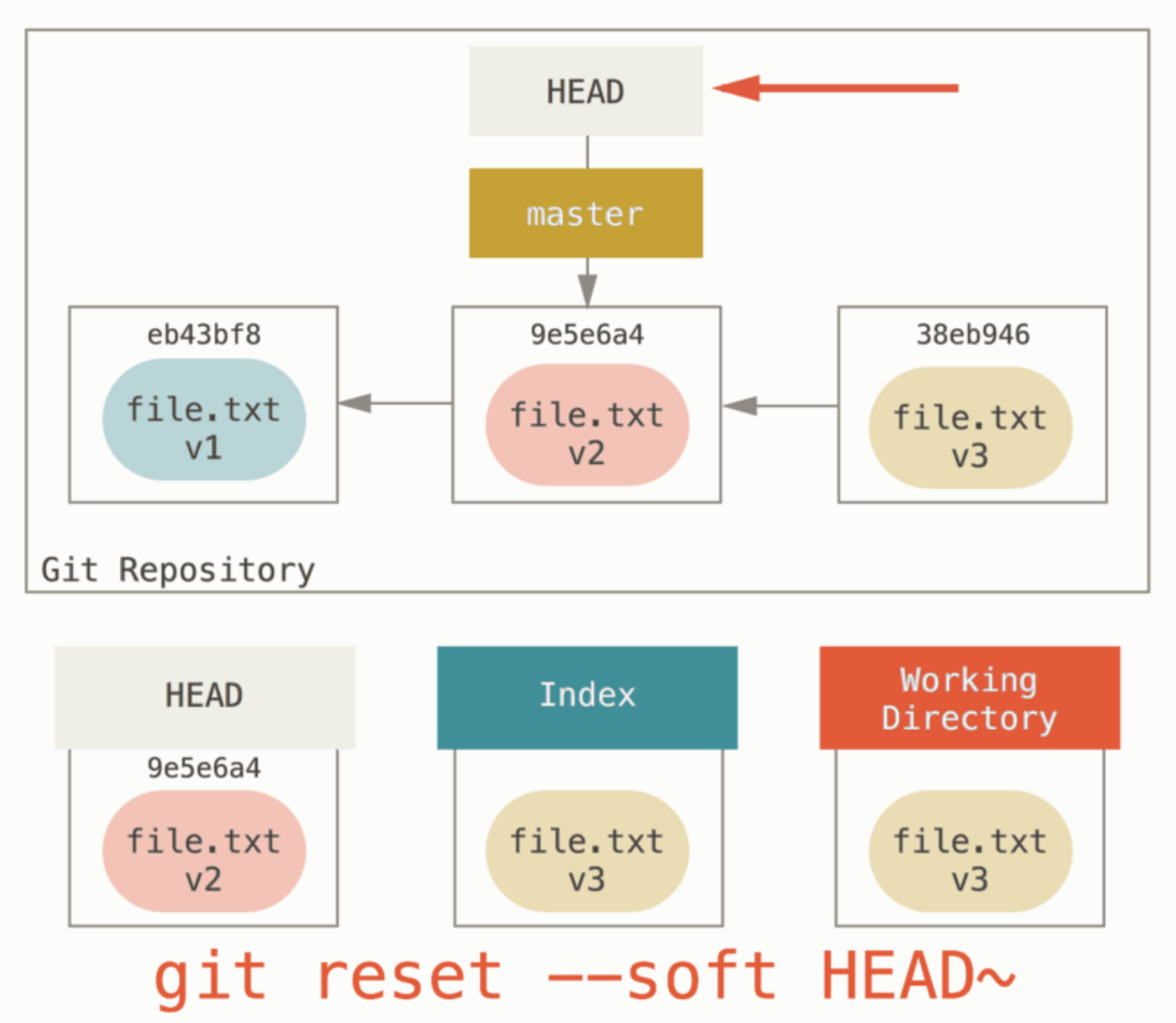 명령어는 HEAD만 이동시키고, 인덱스(Staging Area)와 워크스페이스는 변경하지 않습니다. 즉, 이전 커밋의 변경 사항을 워크스페이스에 적용하지 않고 HEAD만 이동시켜 이전 커밋 버전으로 되돌아갈 수 있습니다. 인덱스에는 해당 커밋 이후로 추가된 변경 사항들은 그대로 남아있게 됩니다.