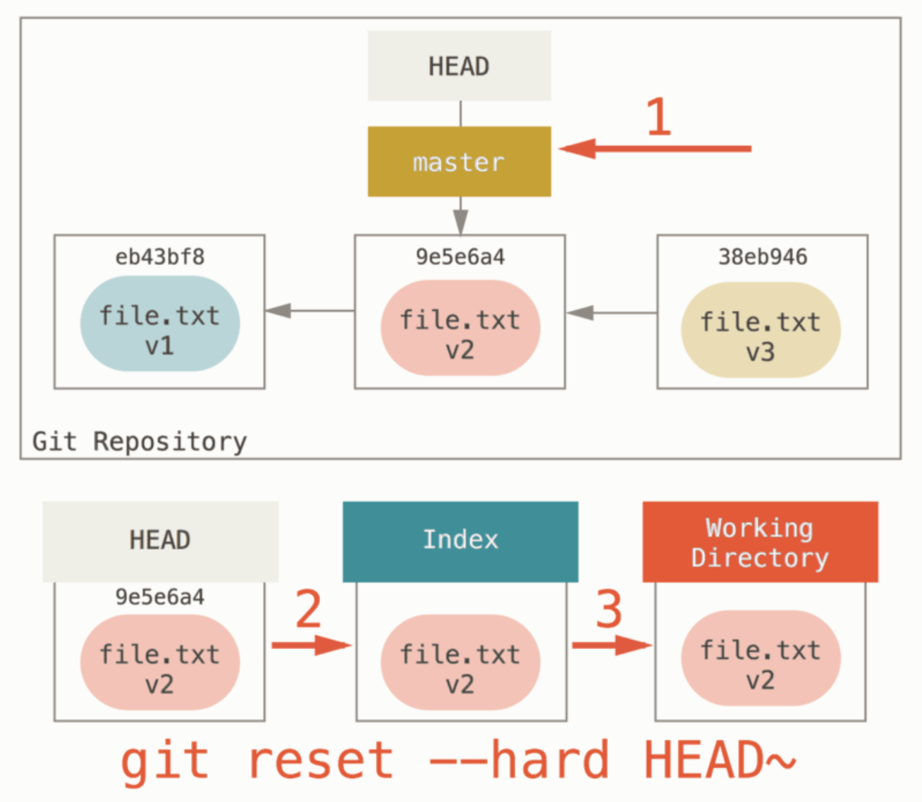 명령어는 HEAD 포인터를 이동시키고 인덱스(Staging Area)와 워크스페이스를 모두 지정된 커밋 버전으로 업데이트합니다. 만약 커밋한 적 없다면 Git이 덮어쓴 데이터는 복원할 수 없습니다.