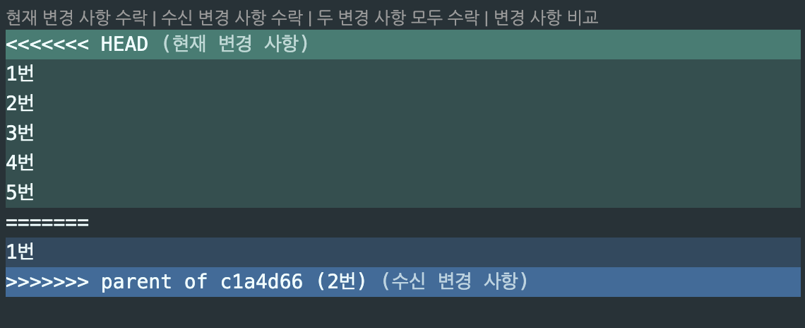 2번 커밋으로 돌아가고 싶었지만, 충돌의 흔적을 보면 수신 변경 사항에 1번