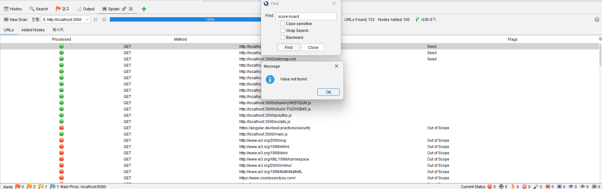 따라서 zap의 기본 스파이더로는 score-board를 찾을 수가 없었던 것입니다.