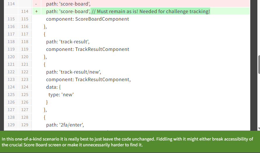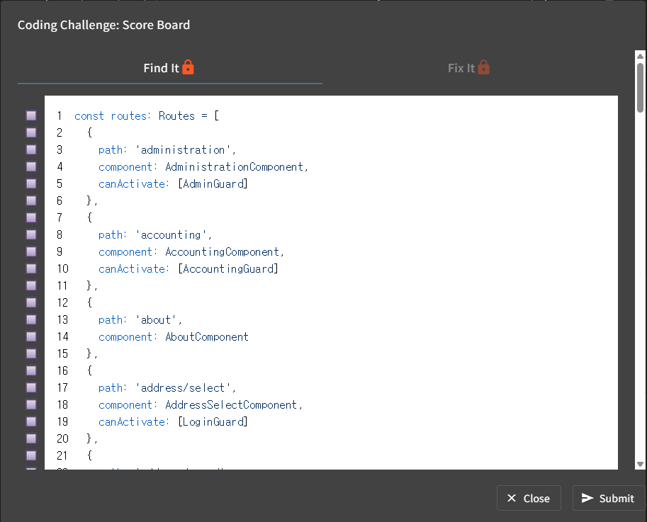 Fix It의 정답은 아무런 수정을 하지 않는 것입니다. 처음엔 저도 이게 무슨 말인가 했는데, 아마 score board 페이지는 접근이 제한되어야 하는 페이지가 아니라고 보는 것 같습니다. 난독화나 권한 검사 등을 추가하면 접근해야 할 일반 사용자의 접근성이 떨어지기 때문에 아무런 조치를 하지 않는게 정답인 것 같습니다.