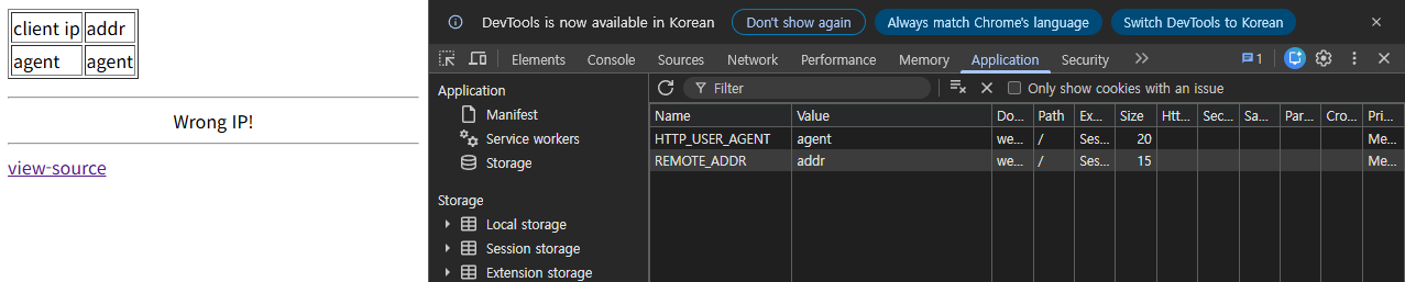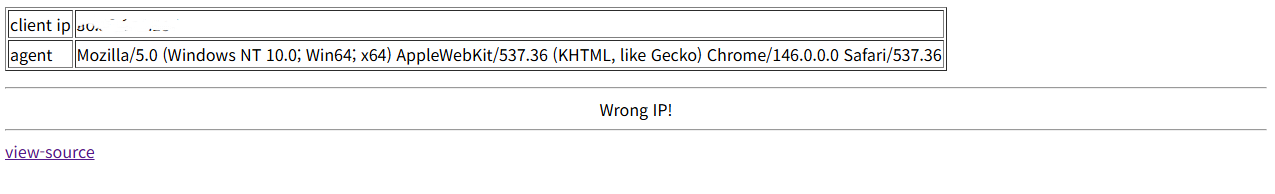 접속하면 사진과 같이 client ip와 agent가 나오고, 아래에는 Wrong IP!라는 문구가 나옵니다.