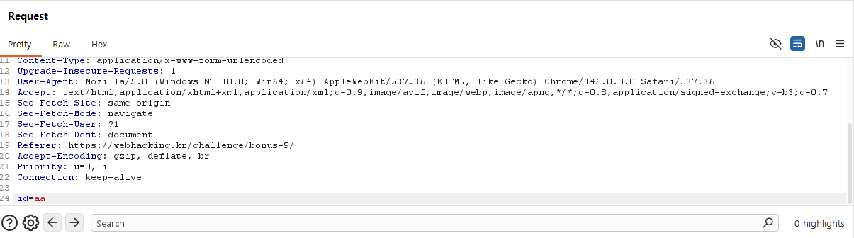 그럼 사진과 같이 패킷이 잡히고 Request 탭에서 패킷을 수정할 수가 있습니다. 아래의 id=aa 부분에 %0d%0aYourIP:admin 을 추가하면 동일하게 풀 수 있습니다. 여기서 %0d%0a는 CSRF(개행 문자)입니다.