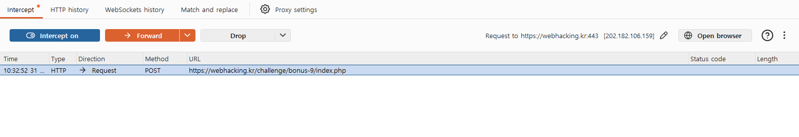 문제에 접속한 뒤 사진처럼 Intercept를 on으로 바꾸고 로그인 버튼을 눌러보겠습니다.