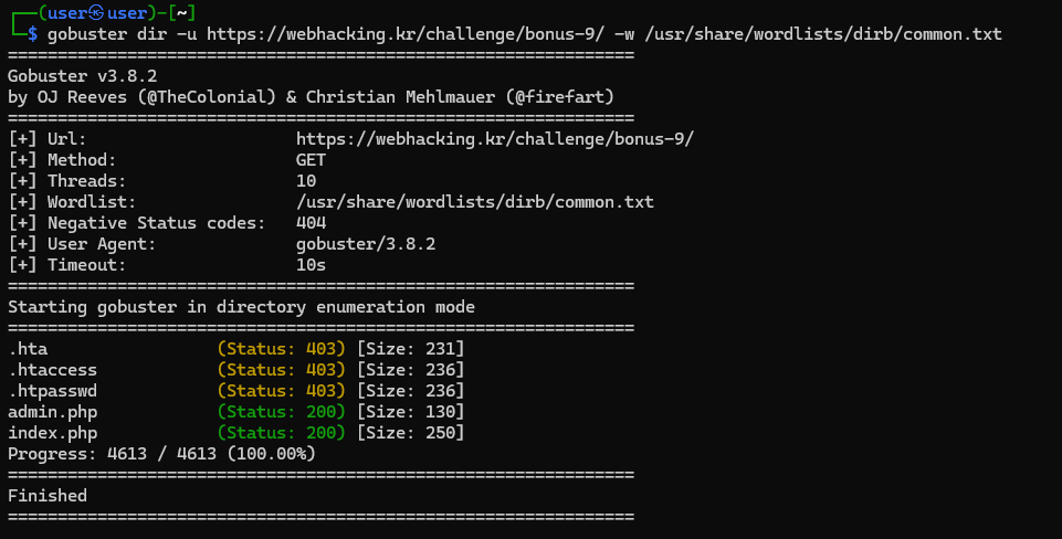 만약 주석이 없어도 Gobuster(https://velog.io/@jinwoo_kim/Gobuster-%EC%95%8C%EC%95%84%EB%B3%B4%EA%B8%B0) 라는 도구를 통해 위 사진처럼 admin.php를 찾을 수 있습니다.