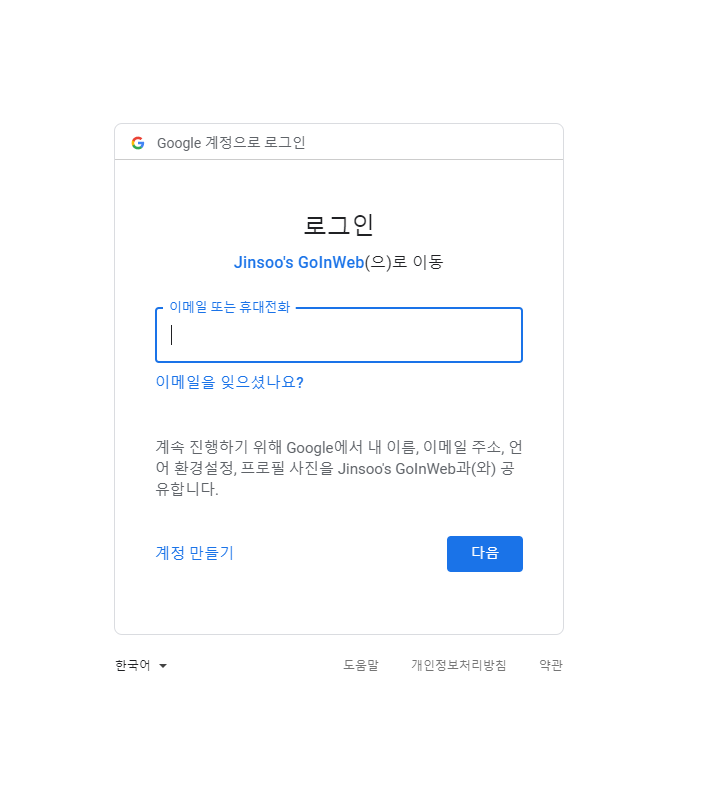 로그인 창에서 구글 로그인을 클릭