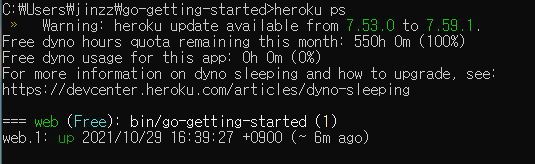 heroku ps를 입력하면 현재 서버의 상세를 볼 수 있다.