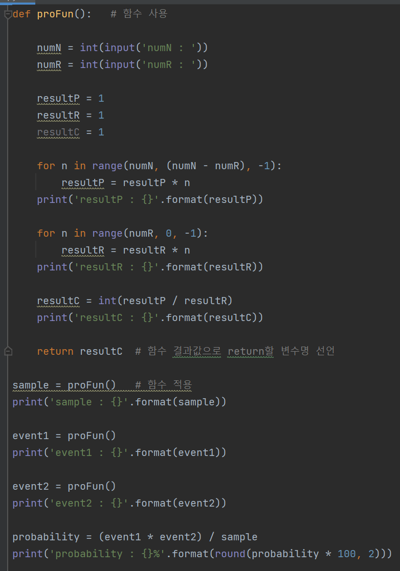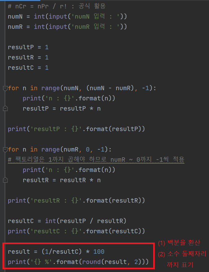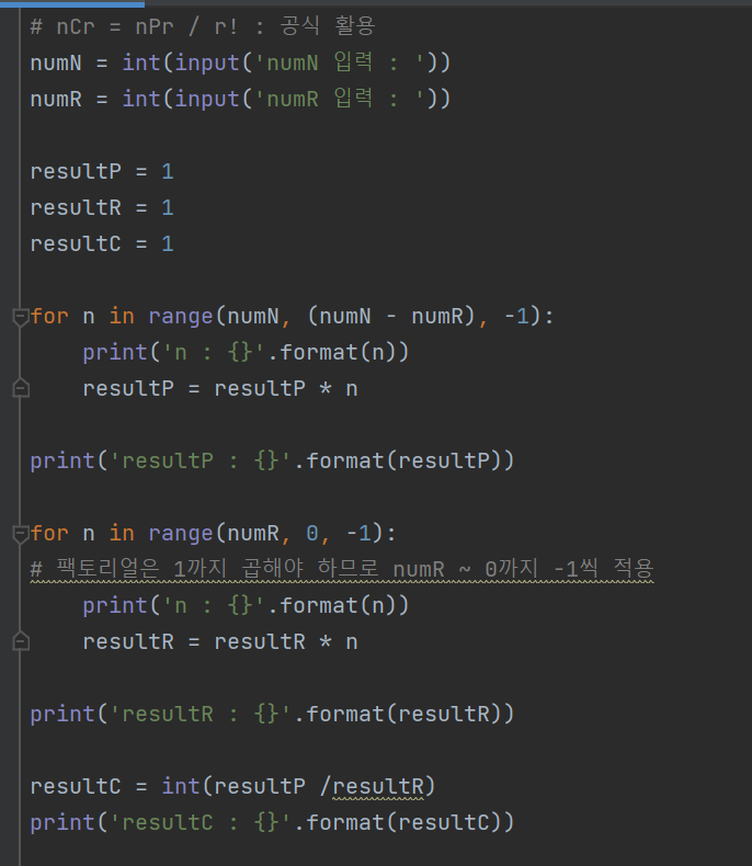 [ 예제 3 ] 파이썬을 이용해서 다음 조합들의 값을 구하는 프로그램 만들기