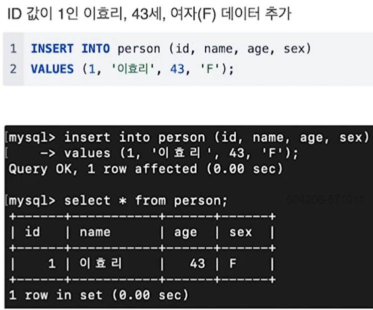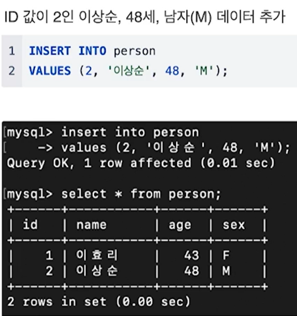 모든 컬럼값을 추가하는 경우에는 다음과 같이 컬럼 이름을 지정하지 않아도 되지만, 입력하는 값의 순서가 테이블의 컬럼 순서와 일치하도록 주의