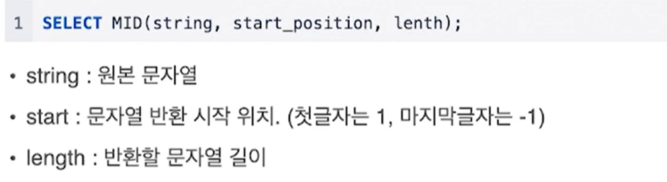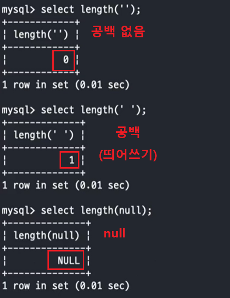 - 단, NULL의 경우 길이에 해당하는 대상 자체가 없으므로 '0'이 아닌 'NULL'값으로 표기