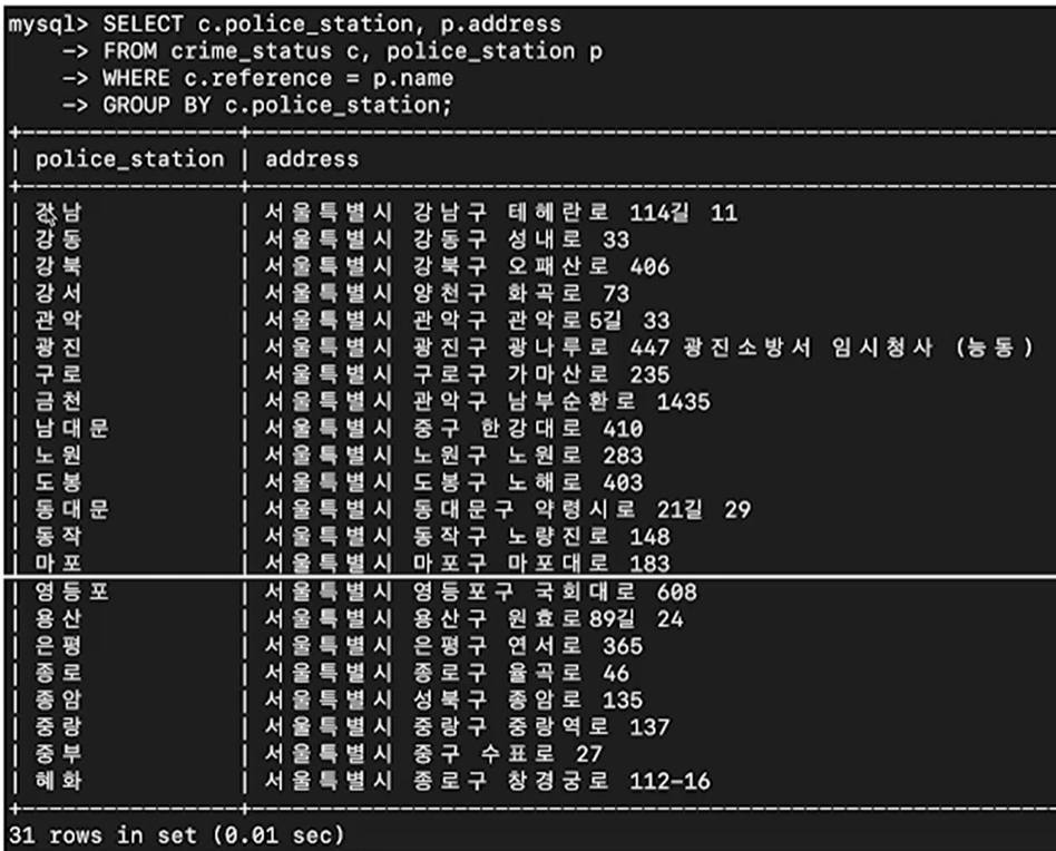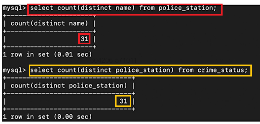 - 분석 1 : police_station.name과 crime_status.police_station을 distinct 하여 count한 결과 동일한 개수임을 확인