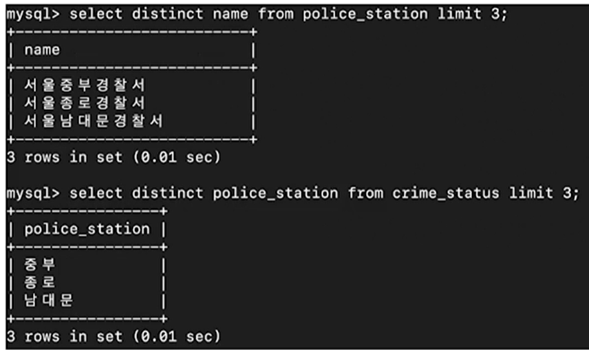 - 분석 2 : 그러나 각 테이블마다 경찰서 이름을 표시하는 형식이 상이함