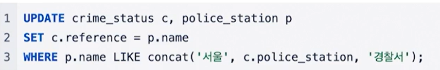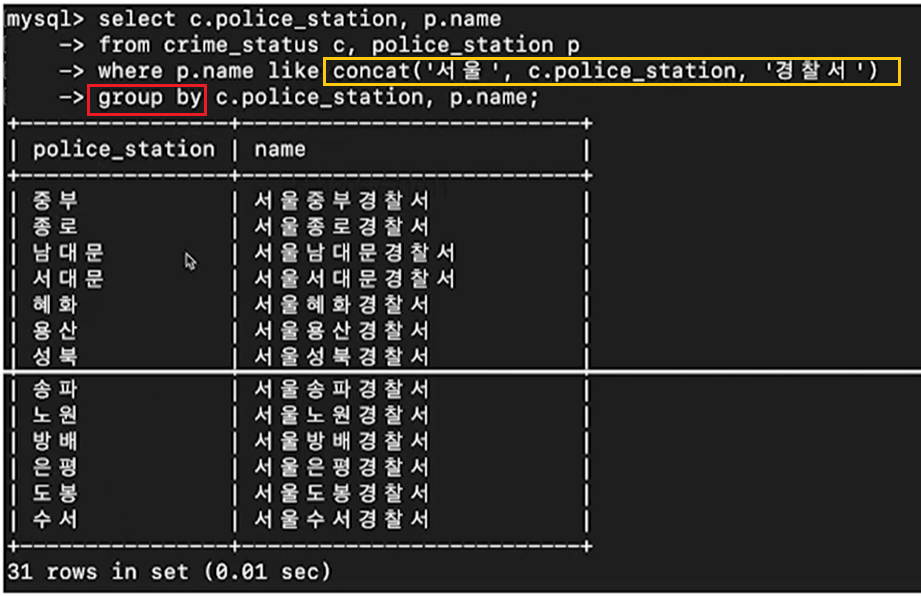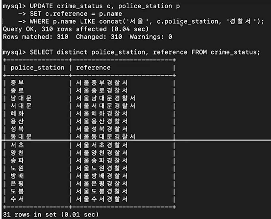 (3-1) 경찰서 명칭을 약식으로 표기한 crime_status 방식의 표기 앞뒤에 '서울'과 '경찰서'를 concat으로 묶어주기 / 동일한 형태가 되는지 확인