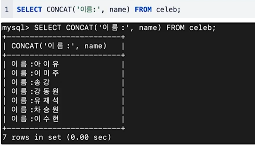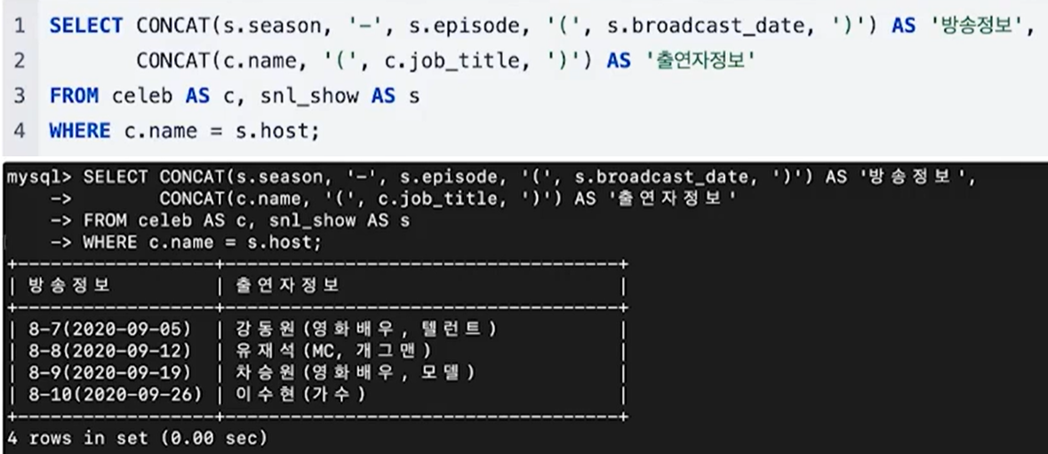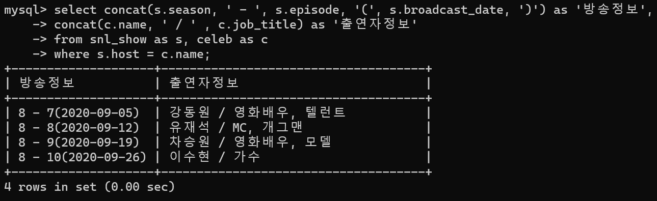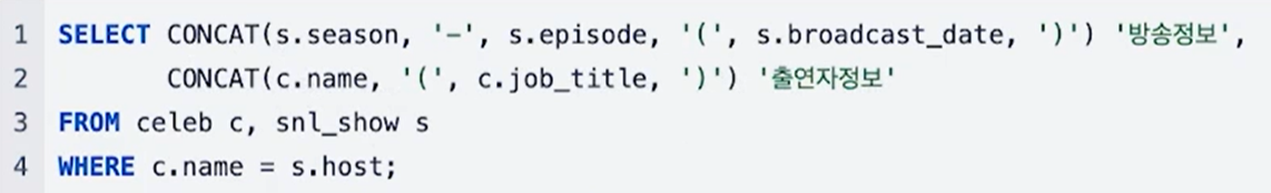 -> concat(s.season, ' - ', s.episode, ' / ', '방송날짜: ', s.broadcast_date) '출연정보'