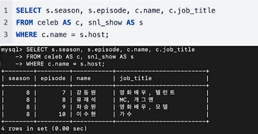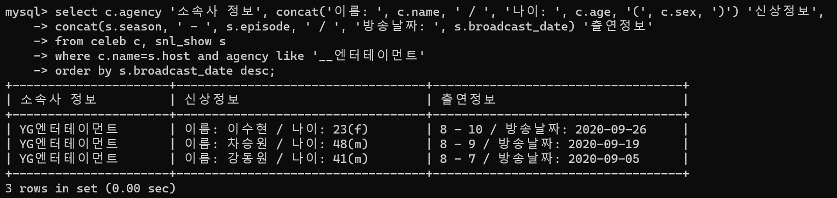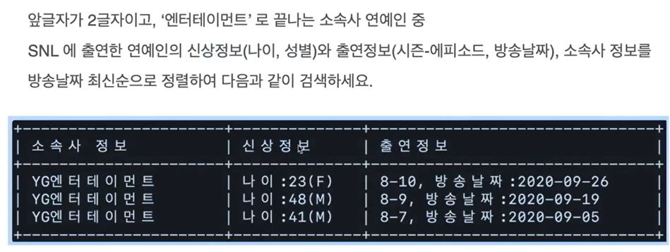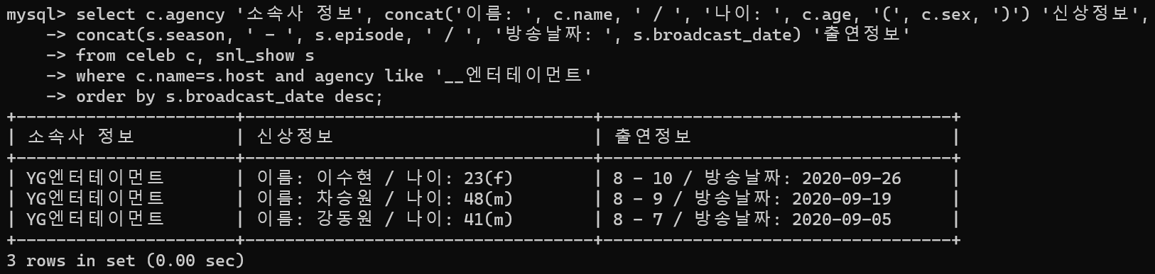 -> where c.name=s.host and agency like '__엔터테이먼트'