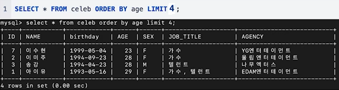 [예제 2] 나이가 가장 적은 연예인 4명 검색