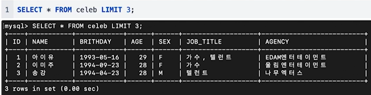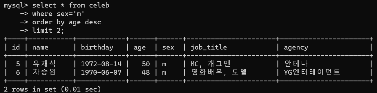 [문제 1] celeb 테이블에서 남자 연예인 중 나이가 가장 많은 2명 조회