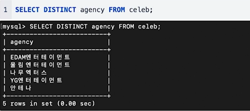 [예제 1] 연예인 소속사 종류를 검색 ( 중복 제외 )