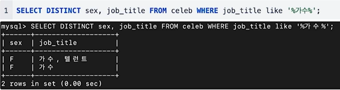 [예제 2] 가수 중에서, 성별과 직업별 종류를 검색 ( 중복 제외 )