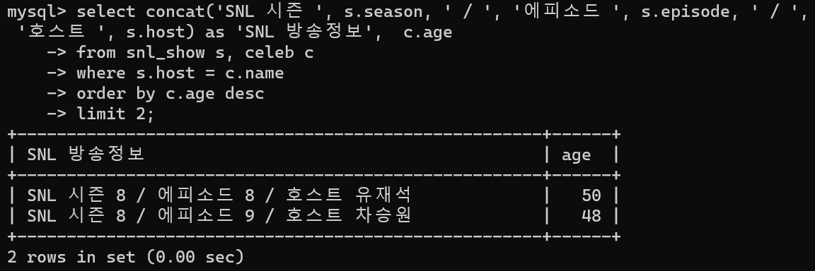 [문제 2] SNL에 출연한 연예인의 정보를 나이가 많은 순으로 2개만 검색